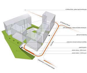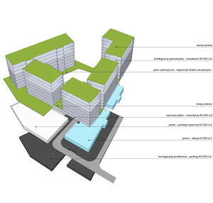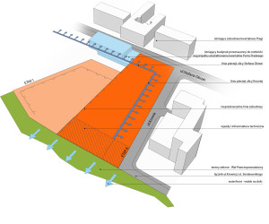 Forma założenia urbanistycznego została zaprojektowana, tak aby jak najpełniej wpisać się w ideę kontynuacji tkanki miejskiej Starej Pragi. Elewacja wschodnia tworzy nową pierzeję ulicy Krowiej, a elewacja północna nawiązuje do projektowanego przebiegu linii zabudowy ul. Stefana Okrzei. Elewacja południowa (od strony kanału Portu Praskiego) wyznaczona jest kształtem terenu inwestycji oraz przebiegiem drogi łączącej ul. Sikorskiego z ul. Krowią. Aby uzyskać atrakcyjny ciąg usług w parterach wycofano kondygnację parteru od strony ulic Krowiej i Okrzei, poszerzając w ten sposób trakt pieszy i uatrakcyjniając architekturę kwartału.